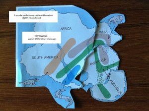 These are the current textbook and Internet depictions of the Pangaea, Gondwana connection – and of their “dis-connection” as the various tectonic plates drifted apart: