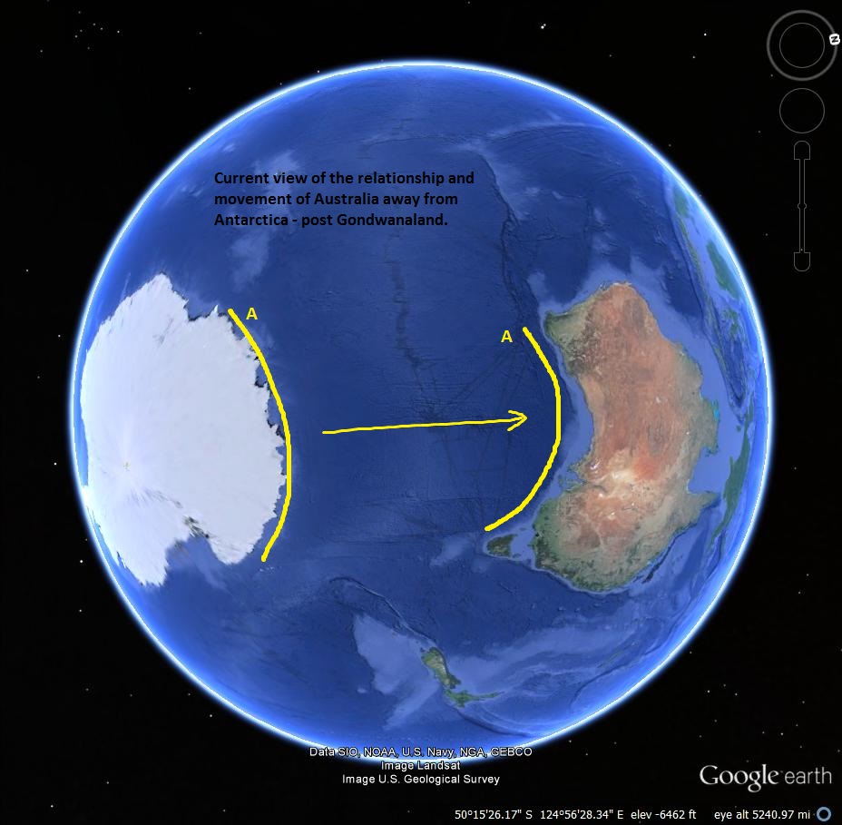 These illustrations above show Australia to be originally attached to the “Eastern” shores of Antarctica. And, as the Tectonic Plates separate, Australia “drifts” in a relatively straight-line direction towards the East – after the destruction of Gondwana (around 250-200 million years ago). Much like This: