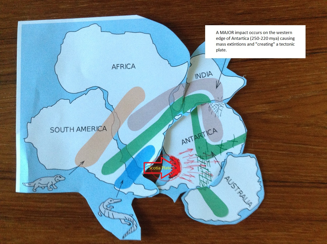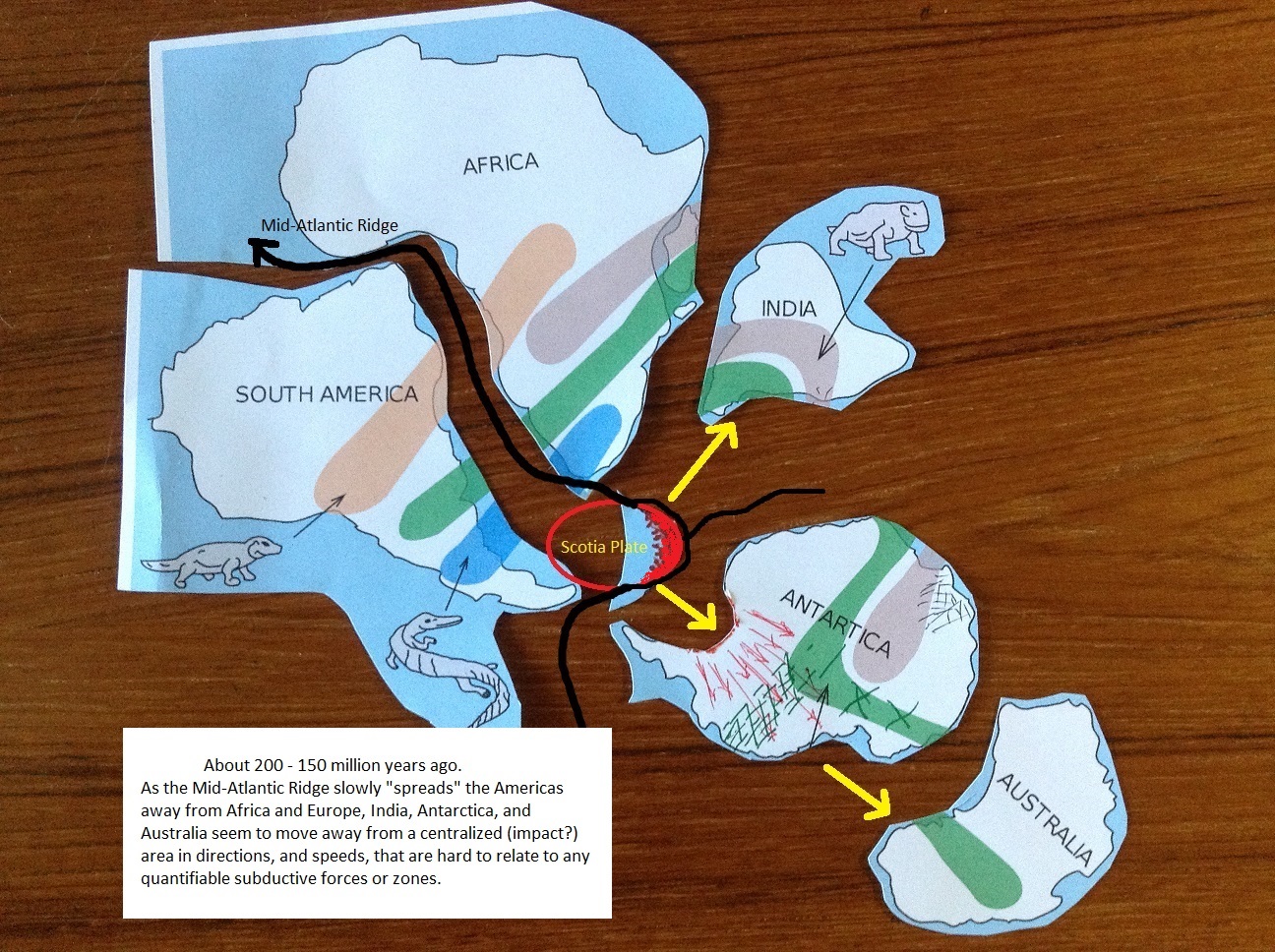 The Hoy-Ensz Theory proposes a different view and chain of events. It begins with a new position for Australia during its Gondwana years, and includes an impact at the tip of South America.